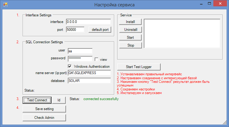 Если данные введены в строке Status: будет написано: сonnected successfully