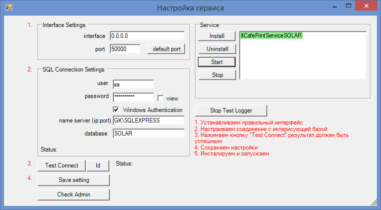 После распаковки запускаете Служба печати, файл PrintService.exe и Вам откроется следующая форма: