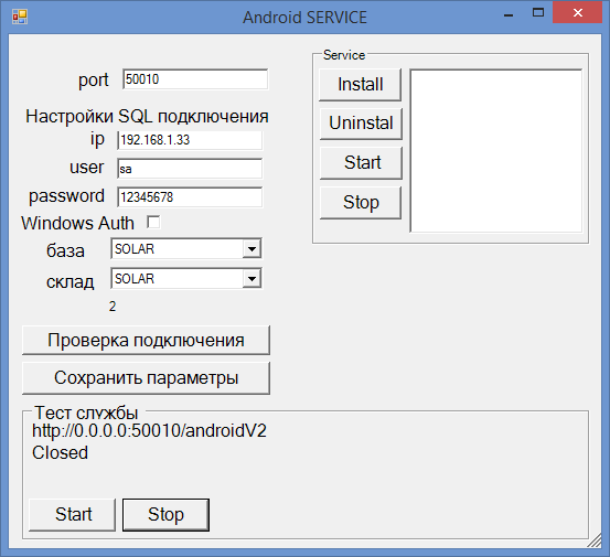 Теперь устанавливаем сервис, нажатием кнопки Install, после установки нажимаем кнопку Start