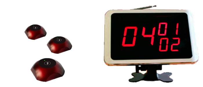 Из кнопки вызова, которая выдается посетителю кафе, либо крепится рядом со столом посетителя или в кабинке, и дисплея отображения вызываемой кнопки.